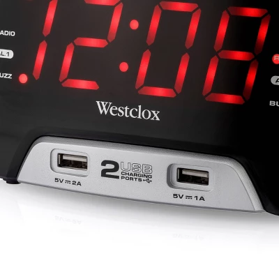 Westclox Large Display Clock Radio. Super functional with adjustable brightness and dual alarms. Wake to music or snooze. Dual USB charging with on at 2A and the other at 1A speed. Up to 20 preset stations available. AC Electric powered. Great for wake up, gentle music or device charging. Great utility and a space saver on your nightstand or desk.