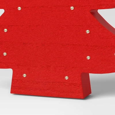 Add a perfect finishing touch to your holiday mantel or entryway console with this Battery-Operated Lit Wood Christmas Tree Figurine from Wondershop™. This Christmas tree figurine made from wood in a bright red color features a light-up design with built-in bulbs to cast a festive glow. The 12-inch tree accent is ideal for tabletop display, and it requires batteries for operation (not included).