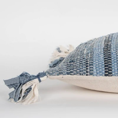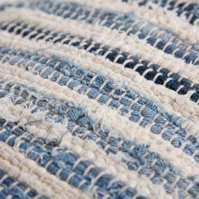 You might recognize your favorite pair of jeans in this Rizzy Home Blue and Ivory Rectangular Striped Pillow — the top is made from 100-percent recycled denim. Using an age-old technique, the denim has been cut into strips, twisted, and stitched together. This pillow is hand-washable –use it with confidence in any room. The back of the pillow is a solid, cotton canvas, joined together with a knife edge, and corner tassels.