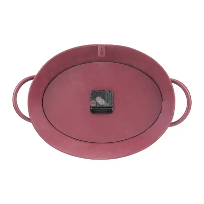 Add a touch of vintage flare to your home decor with a Stonebriar 16.5″ x 10.6″ oval metal wall clock. This clock features a cooking pan frame with a worn red metal finish and rust detail for a retro decor look. The face of this clock features an antique inspired design that has been slightly distressed with Roman numerals. Clock also comes with attached keyhole hanger for easy installation. Clock measures 16.5 inches in length and 10.6 inches in height. It is the perfect size for over the mantel or as an accent for your kitchen, bedroom, or living room. Vintage clock is battery operated and requires a single AA battery (not included).