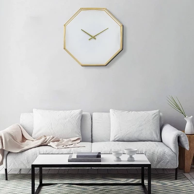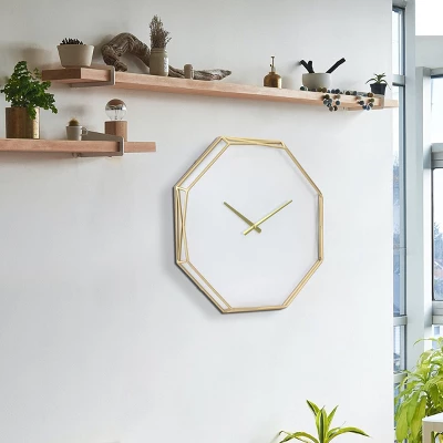 Add a touch of modern flare to your home decor with a Stonebriar 22″ decorative octagon wire metal wall clock. This clock features a geometric gold metal frame with a white clock face for a clean modern feel. Clock comes with attached sawtooth hanger and is easily installed with a screw or wall hook (not included). Clock measures 22 inches by 22 inches and is the perfect size for over the mantel or as an accent for your kitchen, bedroom, office, or living room. Decorative clock is battery operated and requires a single AA battery (not included).