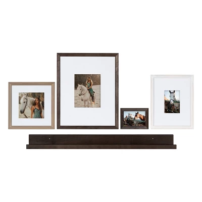 Bring all your memories together with this one-stop frame and shelf kit for your home! Our Bordeaux gallery wall frame and shelf kit include four frames of various sizes and a beautiful shelf to display your favorite pieces of home decor. This set of frames feature gray wash, dark charcoal, and white wash finishes inspired by farmhouse aesthetics. The large shelf included in this set also features a dark charcoal finish to complement the traditional appeal of this collection. The large photo rail display shelf measures at 42 inches wide by 1 inch high by 4 inches deep. Photo frame sizes: (1) 16×20 matted to 8×10; (1) 11×14 matted to 5×7, (1) 12×12 matted to 8×8, and (1) 5×7 unmatted.