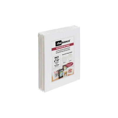 The Ambiance 5-Pack Presentation Mat Picture Frames provide an acid-free, conservation-grade display for your fine art, prints, or photographs. This modern picture frame features a 4-ply (1.4mm) acid-free mat with a white bevel. We adhere strips of acid-free board between the mat and the backing to create a frame pocket with one open edge, making it easy to slide your picture into the frame for convenient display. Moisture resistant, acid-free leatherette protects the frame backing from wear and tear. With a hang tab and an easel back option, you can hang your frame on the wall or display it on a table. Each mat comes packaged in a Krystal Seal® bag, which offers the safest acid-free environment for your artwork. 90-day warranty for any returns, shipping charges may apply.