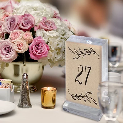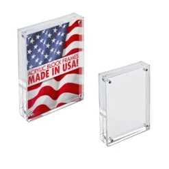 The Imperial Acrylic Block Photo Collection is sleek and modern emphasizing your photo in the most elegant way. The Acrylic Block Frame sits on a thick acrylic base and gives your photo or graphic an upscale look. Thick and Sturdy: each side of the acrylic blocks are ¾ thick making the total thickness of the block frame 1.5 thick and the base is ¾ thick as well. The clear polished edges give these block photo frames a high end finish with a touch of fancy. The crystal clear high quality acrylic photo holder is top loading and designed for easy swap in and out of your photo or graphic. Your picture fits securely inside without moving or sliding. The photo holders sits on its own on a shelf, mantel, tabletop, counter, or desk. The transparent acrylic compliments any décor. The solid acrylic block frames can be used in boutiques, museums, trade shows, hotel lobbies, restaurants, retail stores, schools, at work or at home. Give the perfect gift by inserting a family photo, award certificate, concert ticket, business card, gift card, special poem, or shower gift. Other uses include: wedding or special event table numbers or centerpieces, name plate, photo frame, branding or advertising. Sold in multiples of 1. Sold in Multiples of: 1 Material: Acrylic Graphic Size: 5W x 7H Overall Measurement: 5W x 7.75H Base Measurement: 5OD x 3OD Material Thickness: Two blocks of acrylic 0.75 thick Color: Clear