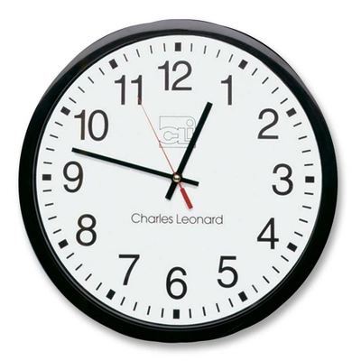 - 12″ wall clock offers precise Quartz movement for accurate time. Large, black numerals against white face provide easy viewing. Black, plastic case has a clear, plastic lens. Wall clock uses one AA battery (sold separately).