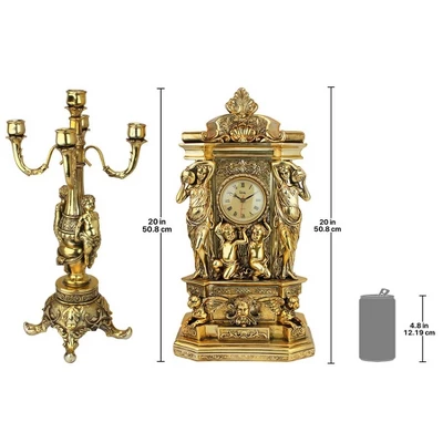 Amidst ornate detailing including water maidens, shells, griffins, and smiling putties, this over-foot-and-a-half-tall, Toscano exclusive clock and candelabra become truly sophisticated period decor. Our classical Greek-inspired works are cast in quality designer resin and finished in faux antique gold gilt. The quality quartz clock boasts Roman numerals while each putti-flanked candelabrum is ready to light the night with your 5 taper candles. Do not leave lit candles unattended. Candles not included. Clock: 11″Wx5″Dx20″H. 12 lbs. Candelabra (each): 8″dia.x20″H. 6 lbs.