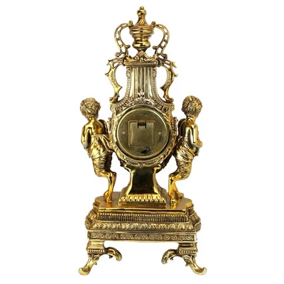 With more than enough character to hold its own amongst your other antiques, a pair of Pan figures flank this period work of decorative art. Amidst swagged garlands of flowers and heraldic crests, this truly ornate clock becomes period decor. Our Rococo work is cast in designer resin and finished in antiqued faux gold. The quality quartz clock boasts Roman numerals with sweep second hand and makes a dramatic statement in any room of your home! Do not leave lit candles unattended. Candles not included. Clock: 12″Wx8½”Dx24″H. 18 lbs.