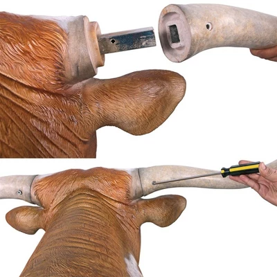 An unmistakable symbol of the great state of Texas, this native to the southwest roamed the range long before the cow punchers were there to round em up. Created for Design Toscano with all the distinctive features of the Texas Longhorn Bull, his nearly six-foot long curved-to-the-fore horns and his handsome coloring are nothing short of spectacular. Cast in quality designer resin and hand painted to capture every detail from this beautiful bovine s handsome brown and white coat, soulful eyes to his realistic horns. This substantially sized a full thirty-inches from the wall Texas Longhorn Bull Sculptural Wall Trophy will be at home on a ranch, a Western themed room or any gallery or office wall. Fit for a cowboy, this Texas Longhorn Bull will become a striking centerpiece over any mantelpiece. Simple assembly required. Includes mounting bracket. 71 Wx30 Dx40 H. 26 lbs. Ships via truck.