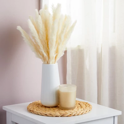 Spruce up your rustic, modern, or farmhouse décor thanks to this set of 40 white pampas grass branches with a ceramic vase. Use the branches in any room in your house, such as the living room, dining room, bedroom, bathroom, or kitchen, as centerpieces; You can also use them for wedding, baby shower, and bridal shower party decor. Perfect for placing in standard vases for your coffee table, dining table, office desk, or mantel. Before use, we recommend placing the artificial pampas grass in the sun to dry out. Use a blow dryer on low heat to keep the faux pampas grass fluffy; please note: shedding is normal and expected.