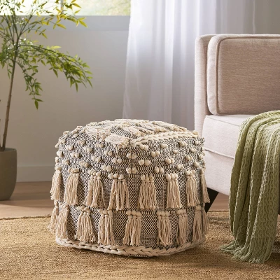HANDCRAFTED BOHO DESIGN: Our handcrafted poufs are expertly designed and made using a centuries-old method. Any natural variations are not product flaws, but rather, will ensure that your purchase is of a truly one-of-a-kind product. With a tassel design in ivory, this lovely pouf is a perfect accessory for any home.