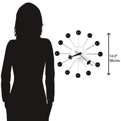 - HIGH QUALITY: The circle design will ensure you can read the time anywhere in the room. Easily tell time with the brushed nickel-finished center, surrounded by 12 black satin balls on nickel-finished rods, and black hands to complete the duo-tone style.