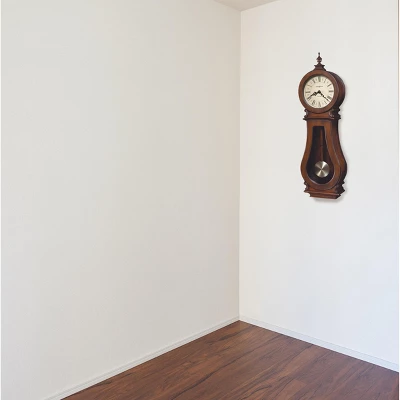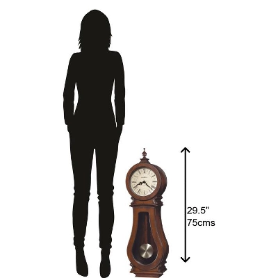 - Attention to Detail: Featuring Tuscany Cherry hardwood, this gently curved clock is a study in precision. The uniquely carved accents along the sides, along with the turned urn finial, lend it unparalleled style. The dial features an aged, old-world finish that allows the black Roman numerals and decorative black hands to stand out. Below is a wooden stick pendulum that shines thanks to its antique brass-finished spun bob.
