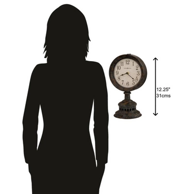 - Antique Style: This metal clock has an antique black finish. It’s enhanced with rust and gray tones for an aged appearance, and it has cut-out details around the base for visual interest. This timepiece is a stylish focal piece for the mantel.