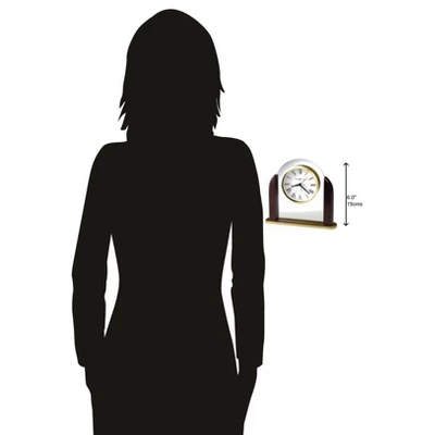 - Roman Numerals: Polished brass-tone bezel surrounds a white dial with black Roman numerals and glass crystal on this clock. The hour and minute hands are black with luminous inserts, making it easier to read in low light. The second hand is black, and the alarm hand is brass.