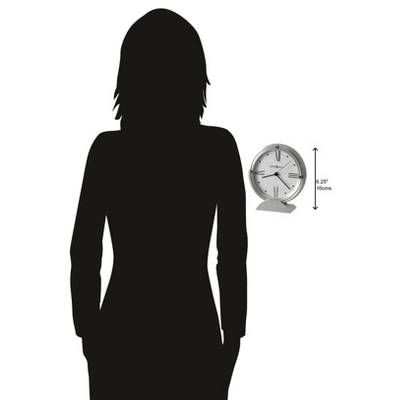 - Elegant Roman Numerals: The classic Roman numerals have a traditional look that contrasts with the white dial and silvertone finish of this table clock. Black hour, minute, and second hands match the numerals and the square hour markers in between.