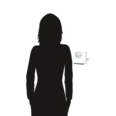 - Tabletop Design: This petite timepiece is crafted from the sturdy beveled glass. Its graceful curved body holds a white dial, which is protected against damage by a break-resistant convex crystal. The glass construction of this analog table clock goes with any type of furniture, whether your preferred style is traditional, modern, or contemporary.