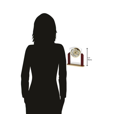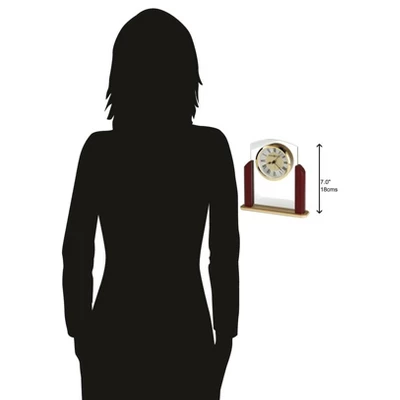- Classic Roman Numerals: This glass table clock features a polished gold-tone bezel, which surrounds the spun, diamond-cut metal silver- and brass-finished dial. For a classic look, black Roman numerals pair with a flat glass crystal front. The black hour, minute, and seconds hands are accompanied by a silver alarm hand for easy readability.