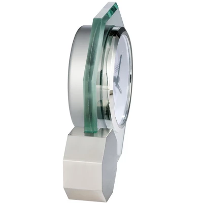 - A glass octagon with beveled edges is complemented by a solid brushed silver finished metal octagon base with polished sides.