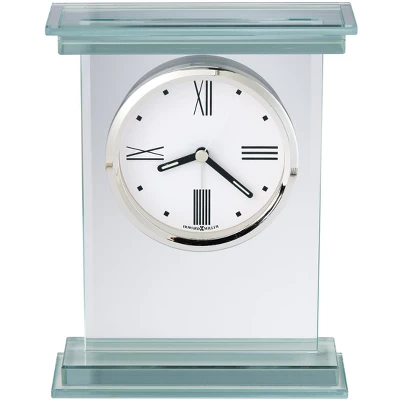 - Modern bracket-style glass alarm clock features a bold, stepped base and top and a polished silver-tone bezel surrounding the dial.