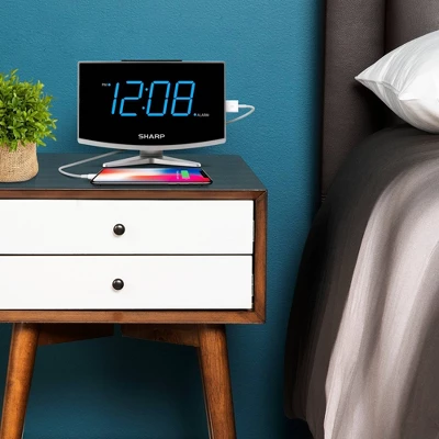 Sharp alarm clock with 1.8″ Blue LED display. Sleek pedestal style case with Jumbo display that can be seen across the room. Simple and easy to Operate The 2 AMP USB port can charge smart phones, digital cameras, MP3 players. High or Low dimmer selection to control the display brightness. High or Low alarm volume control. Silver case/stand. Electric powered.