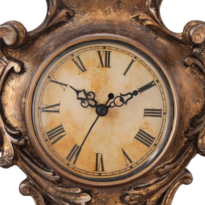 - Antique gold finish. Weathered white clock face with black finish Roman numerals and clock hands.
