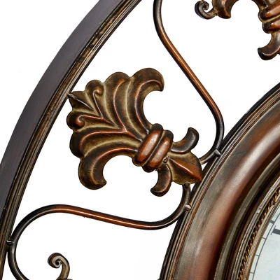 - •Fleur de lis wall clock highlights a faintly distressed walnut brown finish that enhances its rustic look