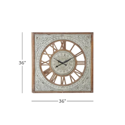 This farmhouse wall clock makes an elegant addition to an entryway, dining room, or den. Requires 1 AA battery. Battery not included. This item ships in 1 carton. Roman numerals appear on the wall clock face. The clock mechanism runs silent. This square wall clock makes use of iron and wood to showcase its concept and design. Can be hung vertically using the D-rings on the back; nails and screws not included. Suitable for indoor use only. This item ships fully assembled in one piece. This is a single brown colored oversized wall clock. Farmhouse style.