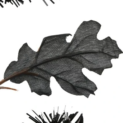 This Halloween wreath features glossy orange and matte black ball ornaments trimming a swirl of black evergreen branch tips that spring from a woven branch ring. Assorted black leaves, stems and fern fronds bring added texture and character. Hang this unique seasonal wreath on doors, walls and windows in indoor or covered outdoor locations.