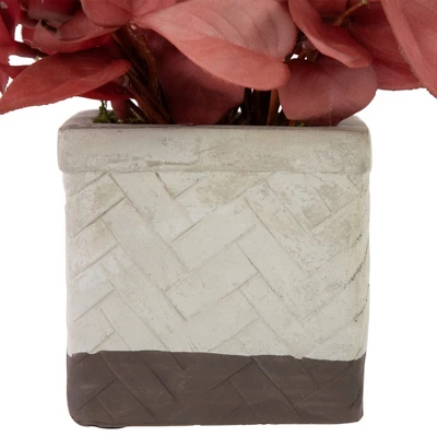 This lifelike Real Touch™ Peperomia Watermelon Begonia plant provides meticulous details and realism, proving the best quality in artificial botanicals. This stunning decorative piece combines nature-inspired beauty with contemporary elegance, making it the perfect addition to any space. The lush, lifelike Peperomia leaves burst forth, radiating vibrant brick red hues that capture attention and infuse vitality into any setting. It is nestled within a lattice pattern square cement pot with a gray and brown color block design. Transform your home or office with this decorative potted plant and effortlessly bring the charm of nature into your space without the need for maintenance.Features:Real Touch™ artificial potted foliage plantFeatures realistic brick red Peperomia leavesThe foliage comes attached to a foam base inside the pot topped with faux dirtNestled inside a square, lattice pattern cement pot with a chocolate brown stripe baseRecommended for indoor use only Dimensions: 7″H x 6″W x 6″D (approximately)Pot: 3.5″H x 3.5″W x 3.5″DMaterial(s): plastic/cement/foam