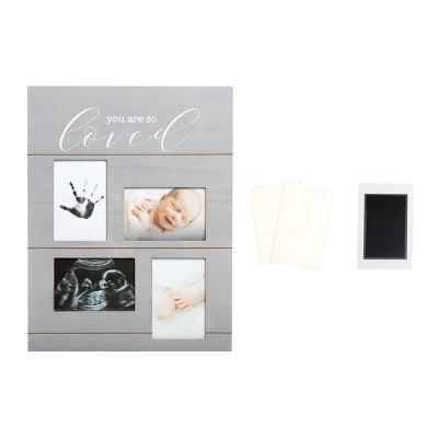 You are so loved. Capture and cherish your little ones print forever with Pearhead’s so loved photo frame. This rustic gray, wooden frame includes everything you need to create a personalized keepsake with your newborn’s tiny print. It includes a clean-touch ink pad ensuring baby’s hand or foot will never touch the ink! To create an impression, make sure the ink is facing down on the included white card and press your baby’s hand or foot onto the clean-touch ink pad. Your baby’s tiny print will be left on the card without any ink on baby! The clean-touch ink pad can be used at most two-times. For newborns only. Ink pads will accommodate hand/feet up to 2.25” wide x 3.5” long. Let dry for 1-2 days. Then you can place the print in the frame along with 3 adorable 4” x 6” photos of your newborn baby. The frame includes “you are so loved” printed in white adding that extra special touch. It also includes a sawtooth hanger and easel to easily hang on any wall or sit on any shelf in your baby’s nursery. This frame is the perfect baby shower gift for any expecting parents! Now you will always be able to remember how little your baby’s piggies were and cherish them with Pearhead’s so loved photo frame.