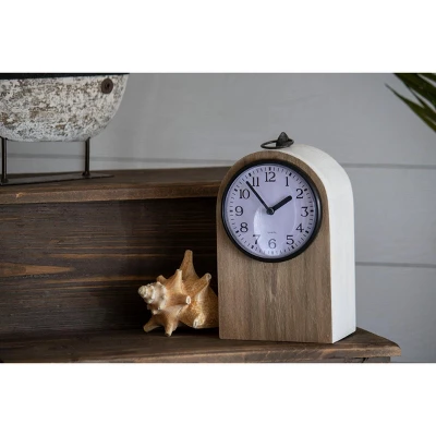 Keep track of time with this traditional tabletop clock. The arched wood structure features a warm wood front accented by a clean white border, and elevated by a glass cover over the clock face sealed with a black metal rim. At the top of the arch you’ll find a decorative metal loop as an added detail. Its natural colors allow this clock to be styled with ease, while still maintaining a timeless feel.