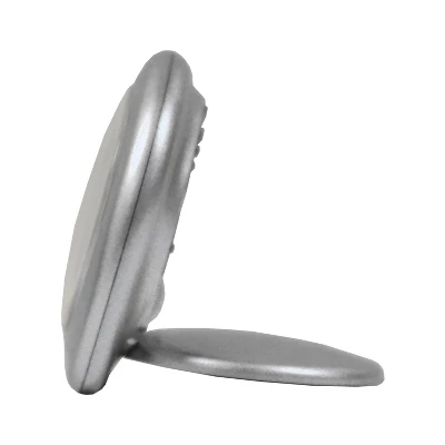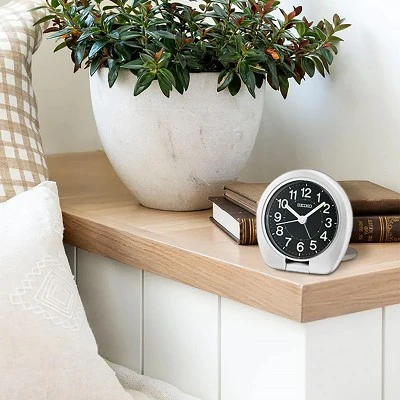 Traveling made easy with this travel clock. It has a silver compact and metallic silver case with folding stand. The ascending beep alarm with snooze and light function by pressing the screen. The luminous hands are perfect for reading in low light. Powered by 1 AAA battery (included). 2.95 X 2.91 X .94 inches. Quartz crystal movement allows for the most accurate time keeping.