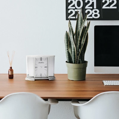 The Seth Thomas Silver Glass Carriage Table Clock is made with an elegant design and stamped dial. White and silver polished finish for a sleek and modern addition to any desk or bookshelf. Carriage shaped and constructed with sturdy alloy and glass. Roman numeral clock face