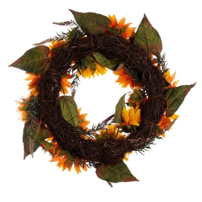 Vickerman 24″ Artificial Yellow Sunflower Wreath with Green Fern Foliage.